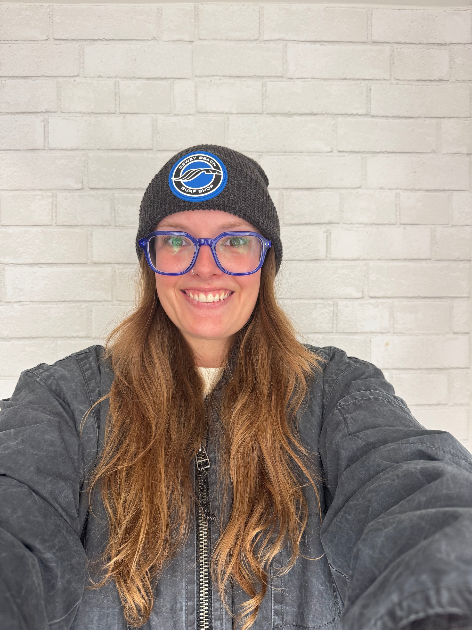 Charcoal knit beanie with the Dewey Beach Surf Shop OG logo front and center.
