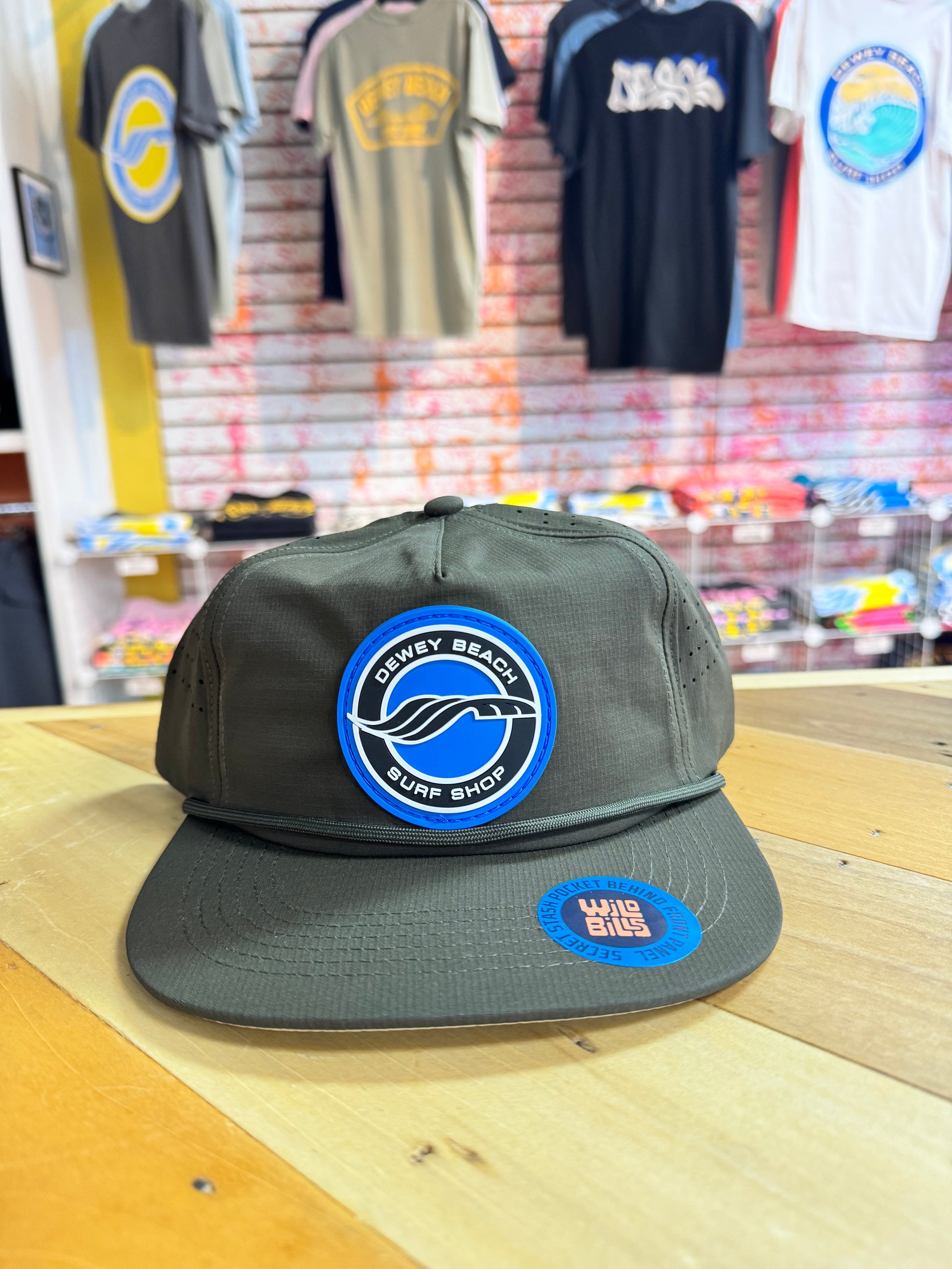 Olive and tan hat with olive rope and Dewey Beach Surf Shop OG patch.