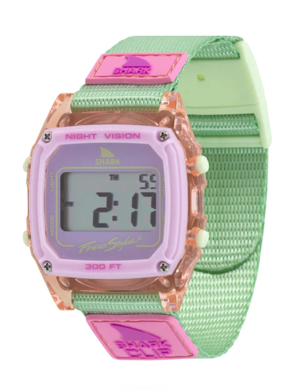 Shark Clip Citrus Twist is soft serve meets citrus pop. With a translucent orange case, lavender face, mint green strap, and bubblegum pink accents, this retro digital watch layers pastels with just the right zing of neon. It’s bright, breezy, and straight out of a 90s boardwalk daydream.
